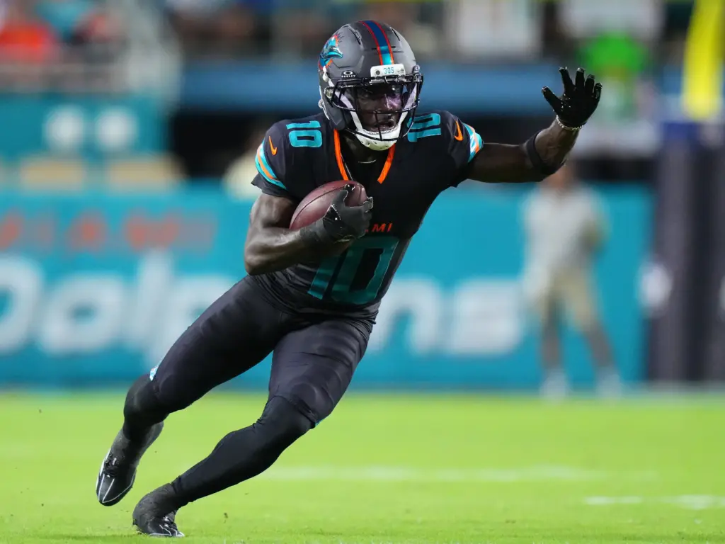 Traded to Miami in 2022 for $120 million, Hill posted back-to-back 1,700-yard seasons (2022-23), six Pro Bowls. 2024 ankle limited to 11 games (1,048 yards). 2025: 261 yards in 4 games before injury. Career: 7,000+ yards, 60 TDs.